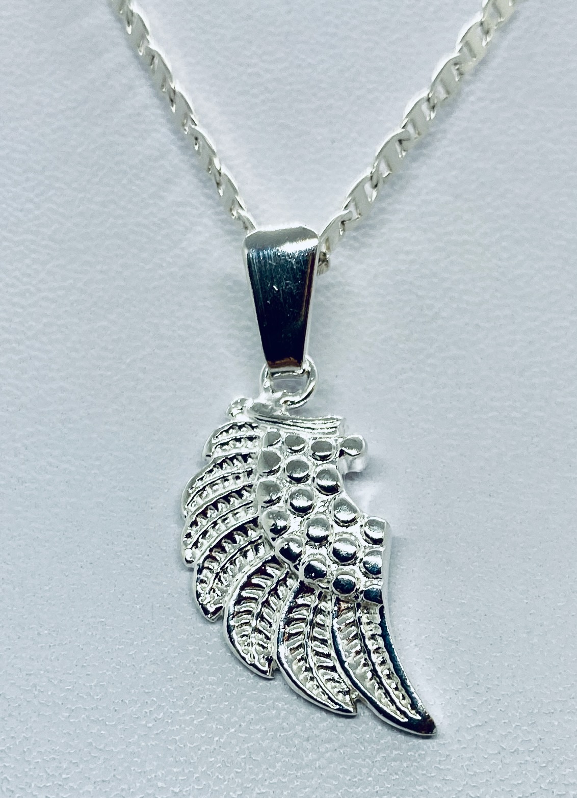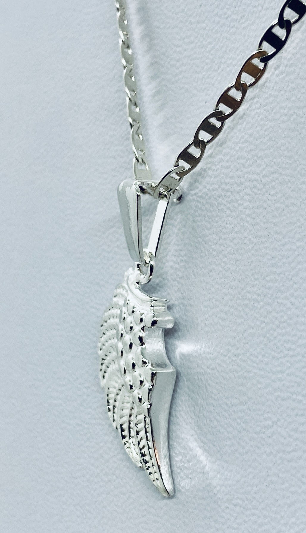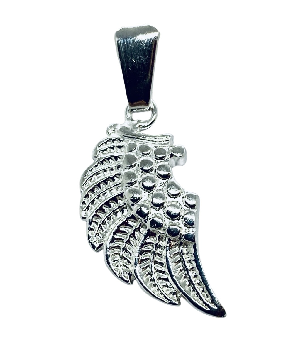 + (99 pesos de envio)Dije de plata ley .925 con forma de ala de Ángel, tamaño chica con terminado liso; cuenta con las siguientes características: Largo: 3 cm (incluido el pasa cadenas)