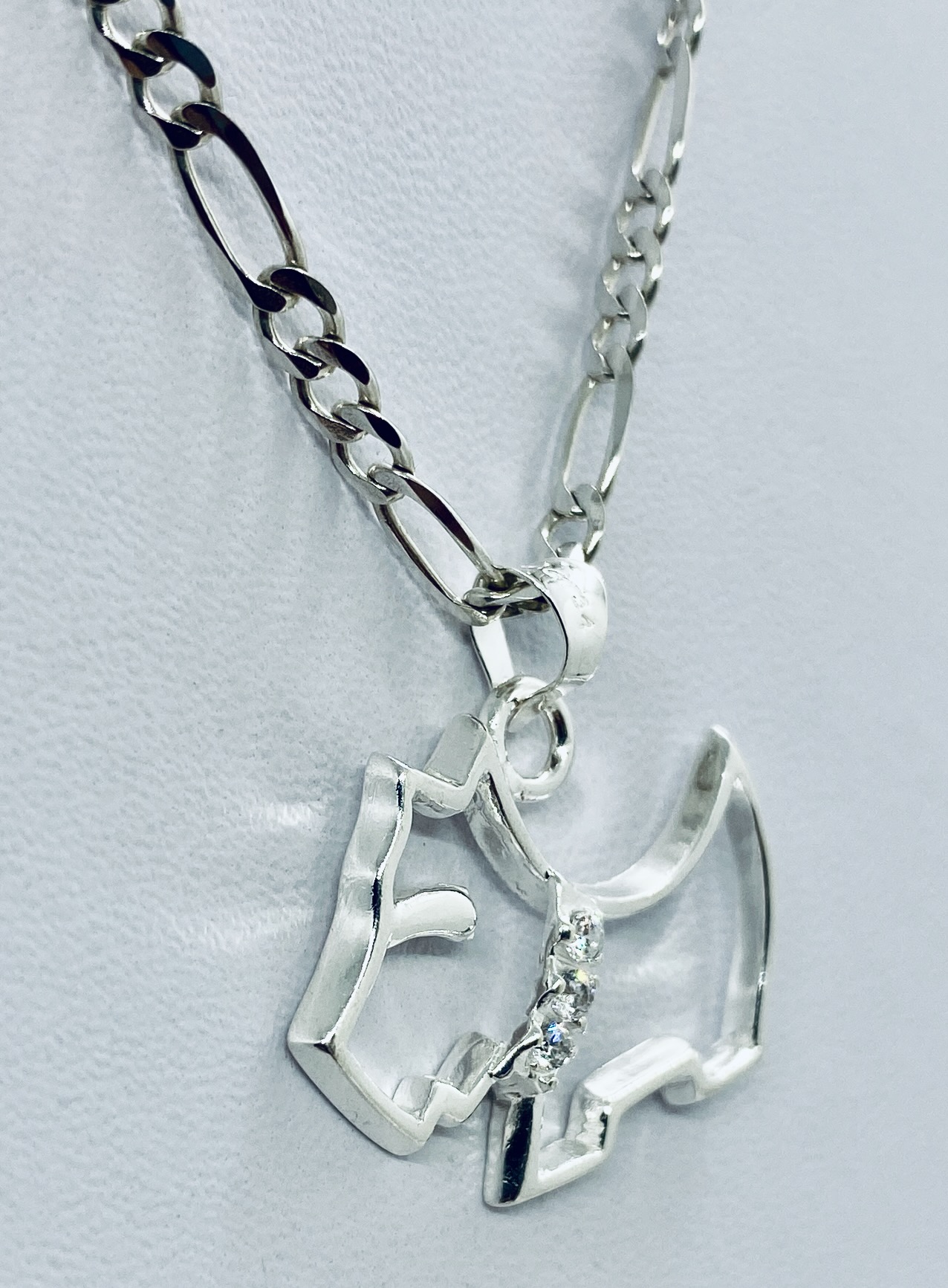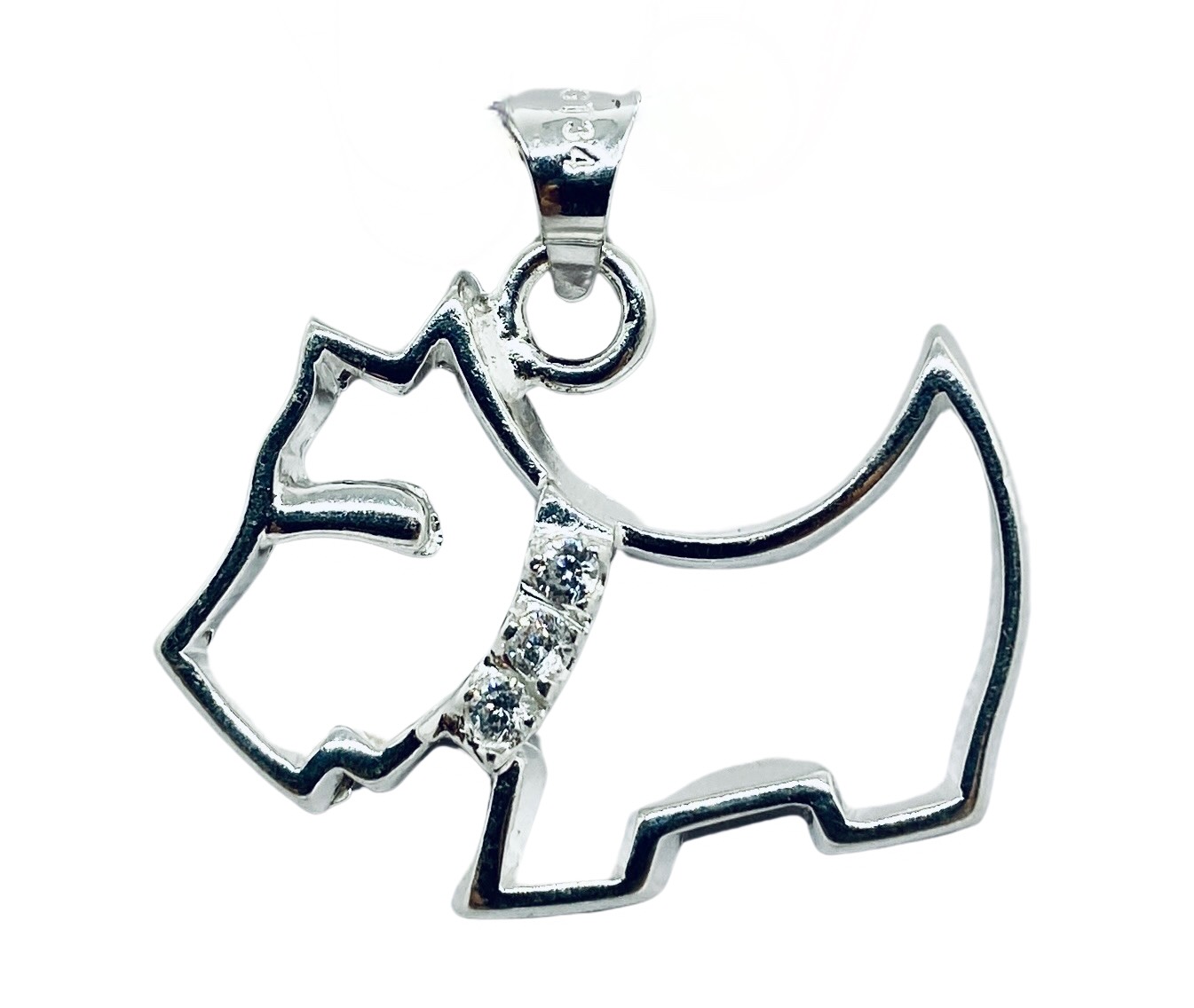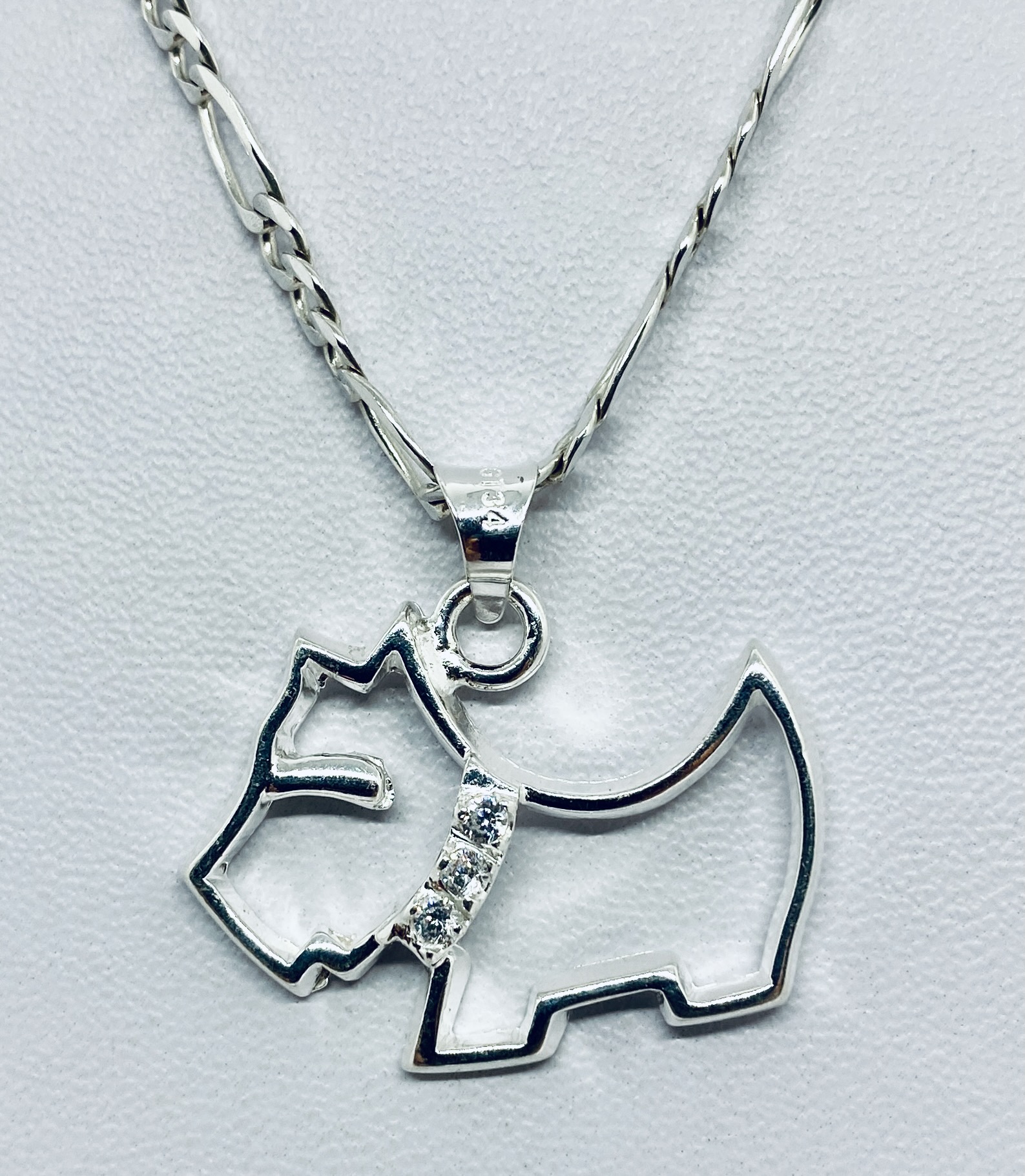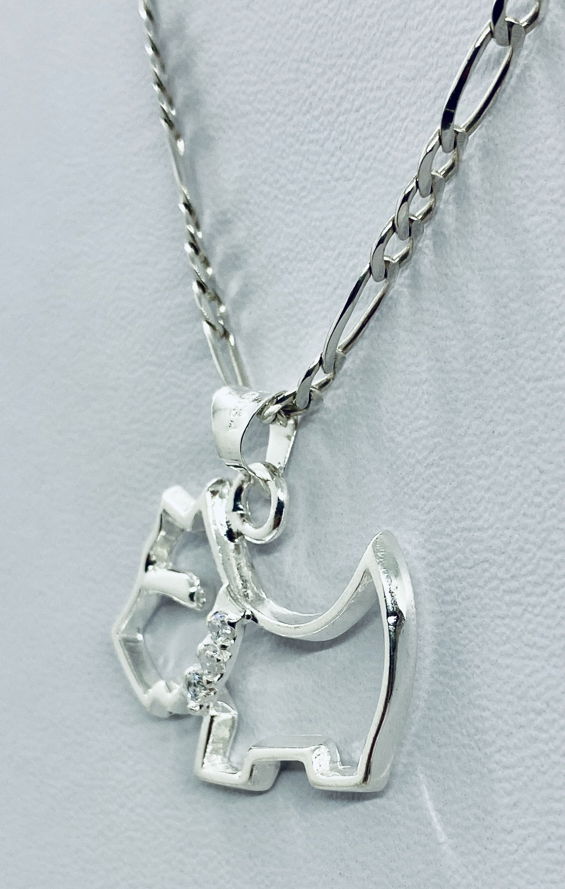 + (99 pesos de envio)Dije de plata ley .925 con forma de perro raza ferrioni, calado y con piedra en el collar, bien detallado y elaborado tamaño mediano; cuenta con las siguientes características:
